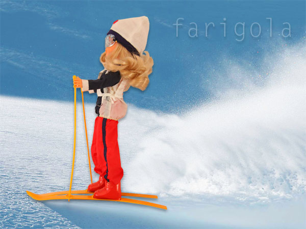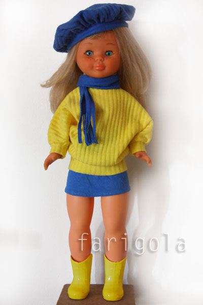 Este conjunto me gusta bastante.... y ya sé que hay quien no soporta los conjuntos de los 80s, pero es que el azul y el amarillo son un contraste que me gusta. Además, la boina creo que le queda genial.La falda es una réplica, porque no la tengo, y también me gustaría encontrar el bolso.
