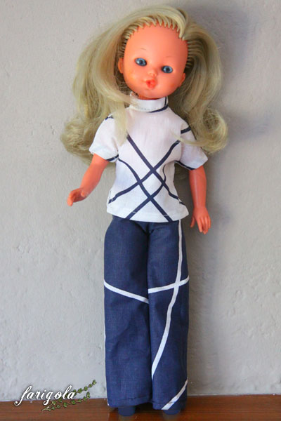 El conjunto que lleva se lo he hecho yo con unos retales que tenía por casa, son muestras que me dio mi hermana de su empresa, porque pensó que quizás me sirvieran para hacer de mis cosas, pero creo que nunca se imaginó que acabarían siendo un conjunto para muñeca... jejeje!